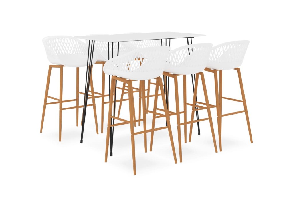 Stolní deska je zhotovená z MDF, takže se snadno čistí. Práškově lakovaný kovový rám přispívá k celkové stabilitě a odolnosti barového stolu. Barové stoličky mají ergonomicky tvarované sedáky s integrovaným nízkým opěradlem v síťovaném provedení. Jelikož jsou vyrobené z robustního PP a podepírají je pevné kovové nohy s termotransferovým potiskem v imitaci dřeva, jsou mimořádně bytelné a dlouho vám vydrží.