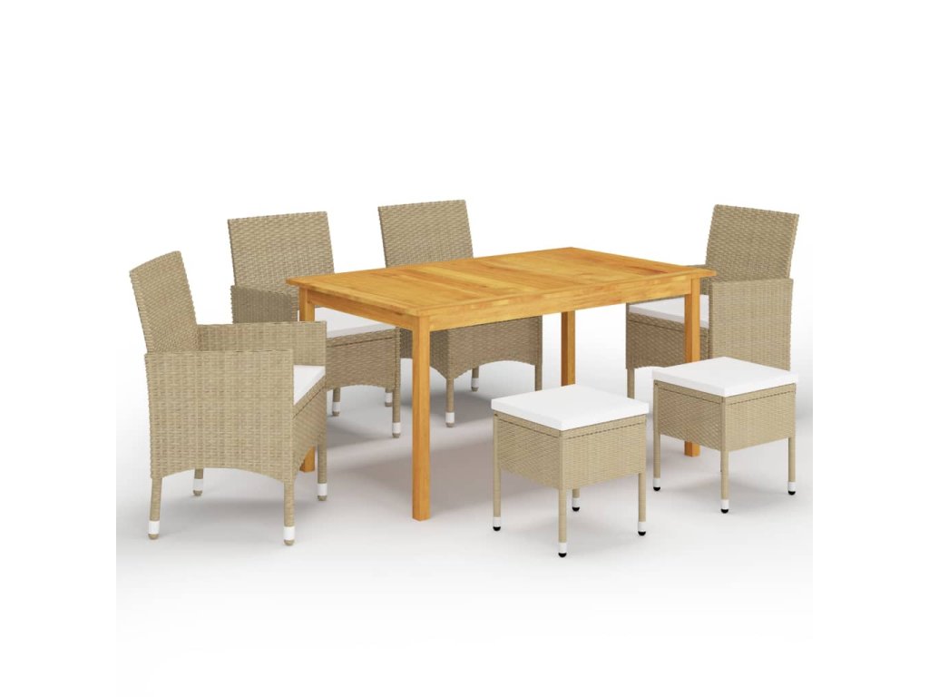 Jídelní stůl je zhotovený z masivního akáciového dřeva s olejovaným povrchem, takže je stabilní, odolný a snadno se udržuje. Bytelné jídelní židle a stoličky mají rám z práškově lakované oceli, opletený PE ratanem, který výborně vzdoruje klimatickým vlivům a snadno se čistí. Zahradní židle mají zaoblená opěradla a područky, což přispívá k většímu pohodlí, stejně jako jejich ergonomický tvar. Každé křeslo je opatřené odnímatelnou, hustě polstrovanou poduškou, abyste si při odpočinku užili mimořádný komfort.
