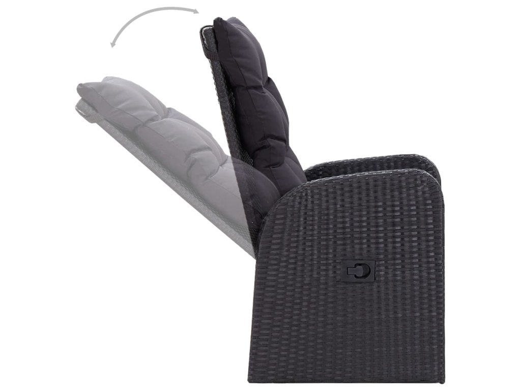 Jídelní stůl je zhotovený z masivního akáciového dřeva s olejovaným povrchem, takže je stabilní, odolný a nenáročný na údržbu. Bytelné jídelní židle mají rám z práškově lakované oceli, opletený PE ratanem, který výborně vzdoruje klimatickým vlivům a snadno se čistí. S polohovatelným opěradlem a opěrkou nohou vám nic nebude bránit v příjemném odpočinku. Opěradlo lze sklopit zatažením za tlačítko na boku. Židle mají lehkou konstrukci, není tedy problém je přesunout, kam potřebujete. Navíc jsou opatřené mimořádně pohodlnými, hustě polstrovanými poduškami pro maximální komfort. Jejich polyesterové potahy nevyžadují téměř žádnou údržbu a dají se stáhnout a vyprat.