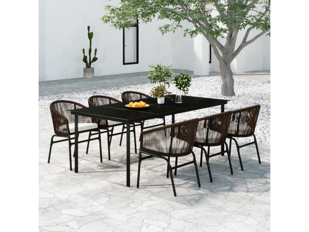 Zahradní jídelní set má práškově lakovaný ocelový rám, takže je robustní a stabilní a ideální pro venkovní použití. Hladká skleněná deska stolu se snadno čistí vlhkým hadříkem a skvěle vám poslouží k podávání jídla a pití nebo k vystavení různých dekorativních předmětů. Židle jsou vyrobené z PVC ratanu, jsou proto odolné a výborně vzdorují UV záření i špatnému počasí. Každá z nich je navíc opatřená odnímatelnou hustě polstrovanou poduškou, a zpříjemní vám tak váš odpočinek.