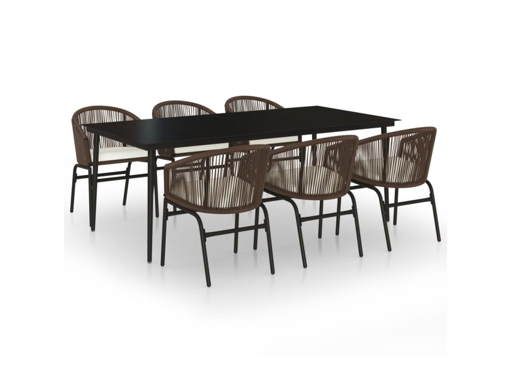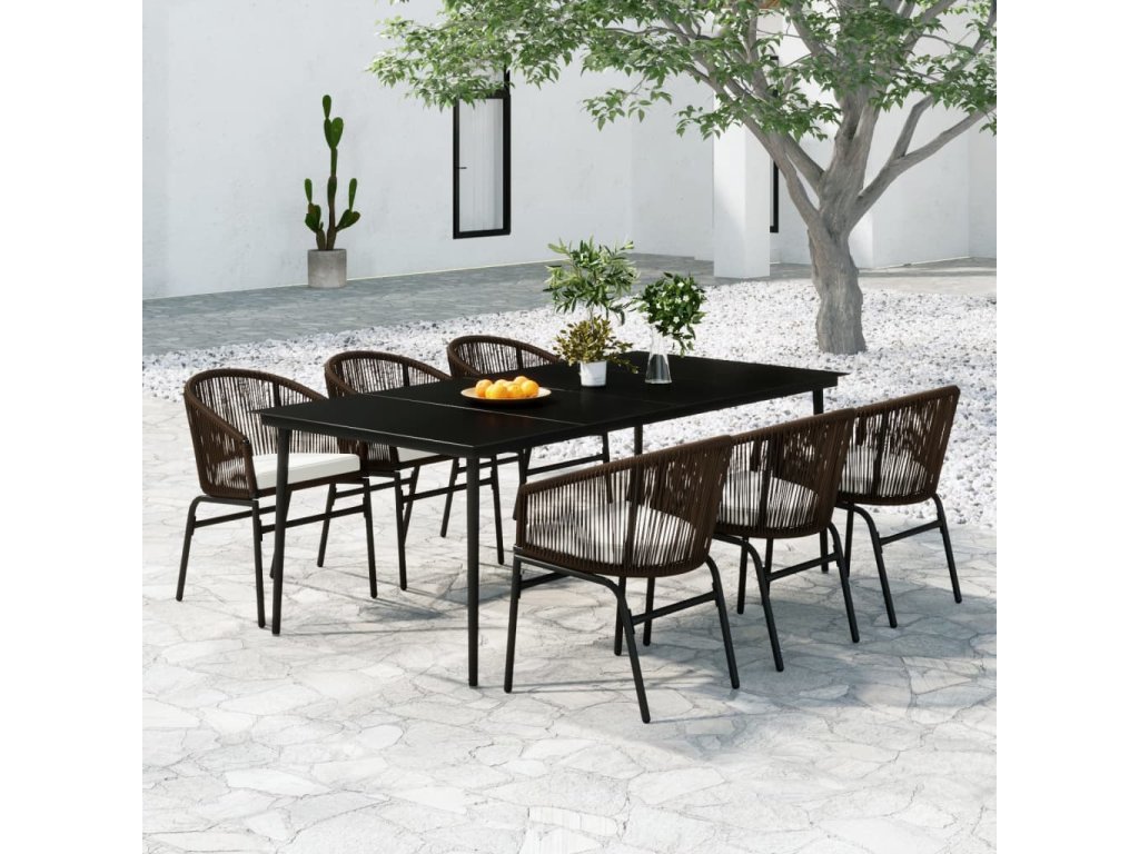 Zahradní jídelní set má práškově lakovaný ocelový rám, takže je robustní a stabilní a ideální pro venkovní použití. Hladká skleněná deska stolu se snadno čistí vlhkým hadříkem a skvěle vám poslouží k podávání jídla a pití nebo k vystavení různých dekorativních předmětů. Židle jsou vyrobené z PVC ratanu, jsou proto odolné a výborně vzdorují UV záření i špatnému počasí. Každá z nich je navíc opatřená odnímatelnou hustě polstrovanou poduškou, a zpříjemní vám tak váš odpočinek.