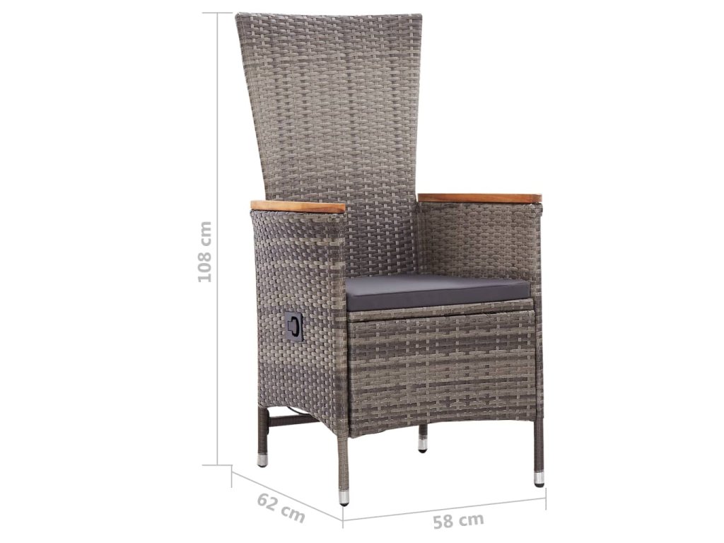 Jídelní stůl je zhotovený z masivního akáciového dřeva, takže je pevný a stabilní. Olejem napuštěný povrch vám umožní používat tento stůl i ve venkovních prostorech. Jídelní židle mají ocelový rám, který je opletený klimaticky odolným PE ratanem, jsou proto bytelné a snadno se udržují čisté. Područky jsou krásně zdůrazněné masivním akáciovým dřevem, které do vašeho domova vnese rustikální šarm. Stisknutím tlačítka na boku můžete sklopit opěradlo a zároveň i zvednout podnožku. Každá židle má hustě polstrovanou podušku, abyste si při odpočinku mohli dopřát mimořádný komfort.