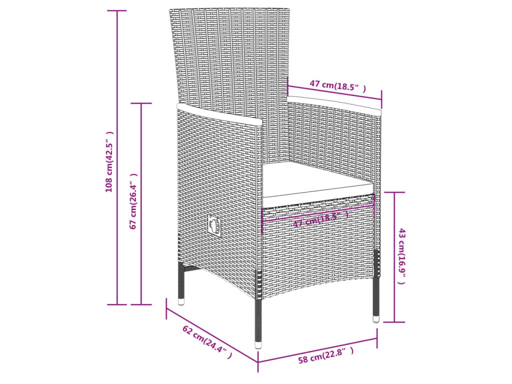 - Rozměry židle (nesklopená): 58 x 62 x 108 cm (Š x H x V)