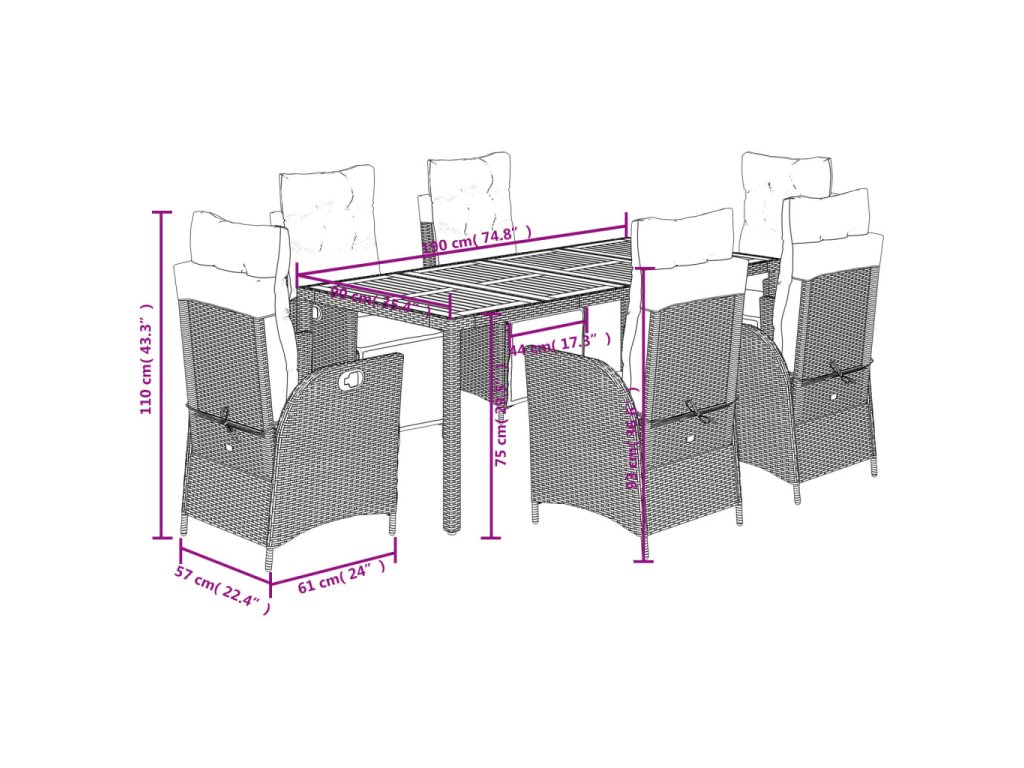 - Materiál: PE ratan, práškově lakovaná ocel, masivní akáciové dřevo s olejovou povrchovou úpravou