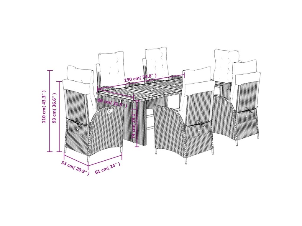 - Materiál: PE ratan, práškově lakovaná ocel, masivní akáciové dřevo s olejovou povrchovou úpravou