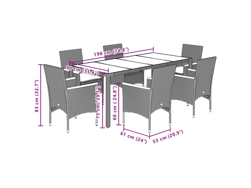 - Materiál: PE ratan, práškově lakovaná ocel, masivní akáciové dřevo s olejovou povrchovou úpravou