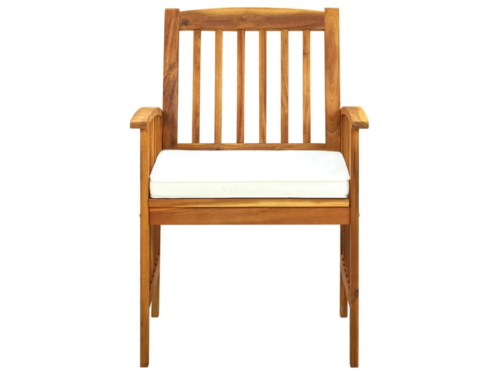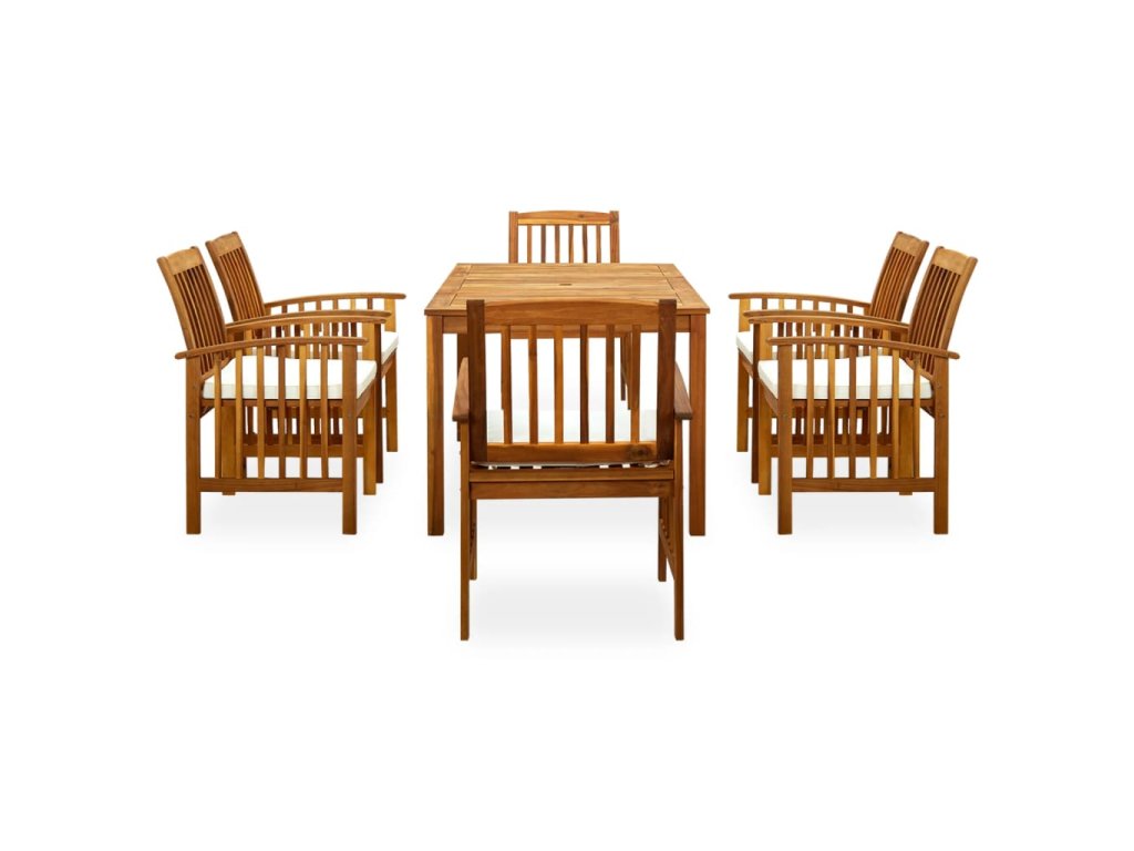 Jídelní stůl je vyrobený z masivního akáciového dřeva, tvrdého dřeva s hustou strukturou, takže je robustní, odolný a snadno se udržuje. Na dřevěnou stolní desku můžete prostřít k jídlu, servírovat nápoje a odkládat si celou řadu věcí. Dřevěné rámy židlí jsou ošetřené olejem a na vaši terasu nebo dvorek vnesou klasický vzhled a vaše venkovní bydlení oživí svým přírodním šarmem. Hustě polstrované podušky vám poskytnou dodatečné pohodlí při sezení a relaxaci. Tuto sestavu zahradního nábytku můžete snadno očistit vlhkým hadříkem.
