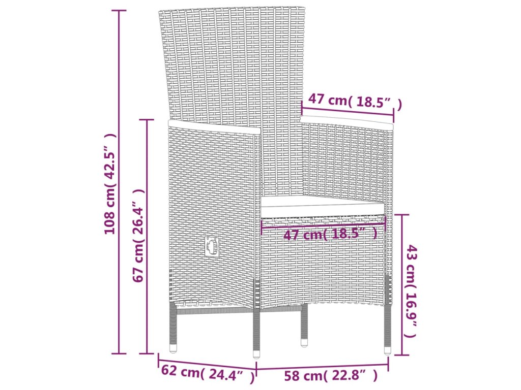 - Rozměry židle (nesklopená): 58 x 62 x 108 cm (Š x H x V)