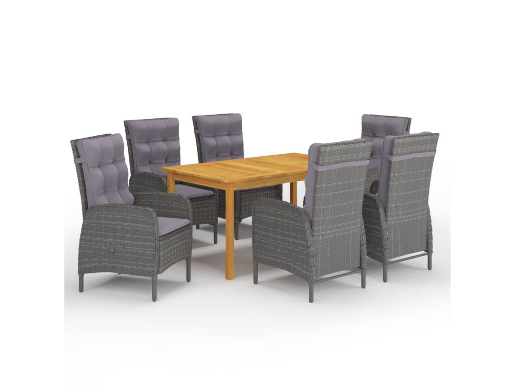 Jídelní stůl je zhotovený z masivního akáciového dřeva s olejovaným povrchem, takže je stabilní, odolný a nenáročný na údržbu. Jídelní židle mají rám z práškově lakované oceli, opletený PE ratanem, který výborně vzdoruje klimatickým vlivům. Dlouho vám proto vydrží a snadno je očistíte. Zahradní židle mají zaoblená opěradla a područky, což přispívá k většímu pohodlí, stejně jako jejich ergonomický tvar. Pro příjemnější komfort jsou součástí také podušky s potahy na zip, které se dají sejmout a vyprat.