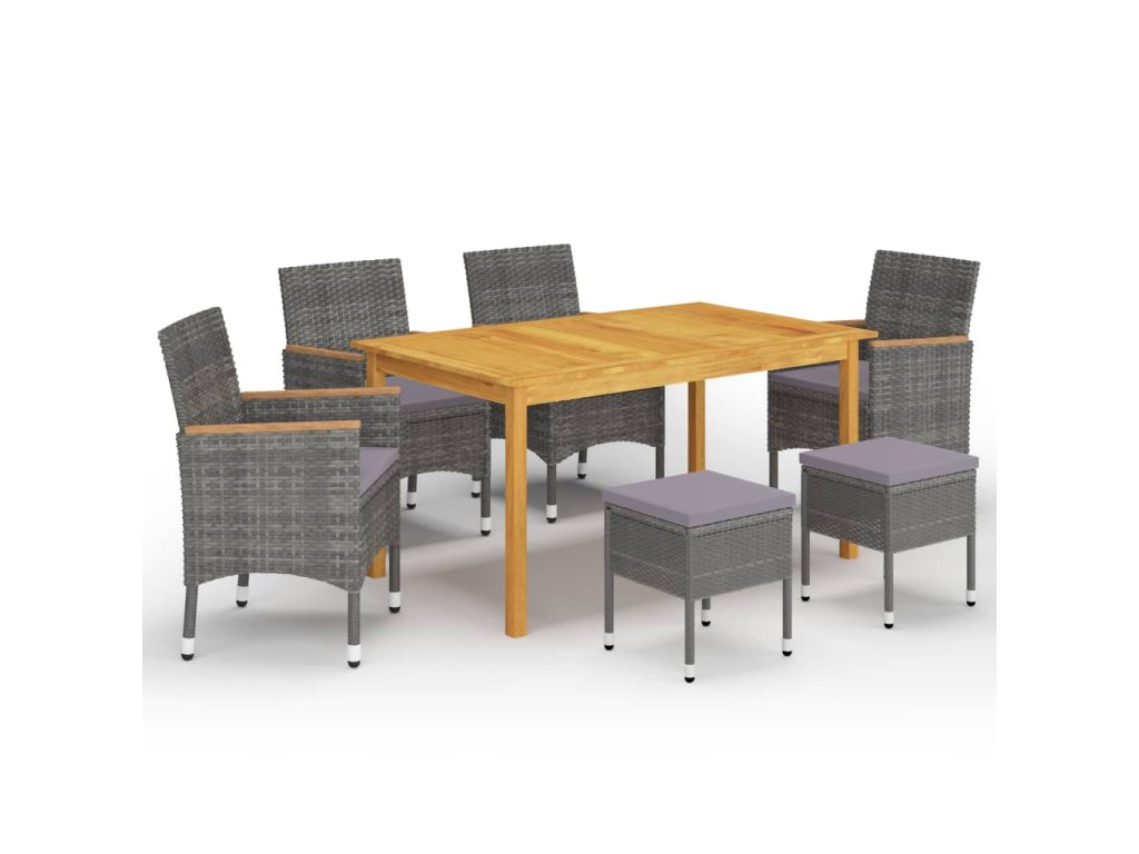 Jídelní stůl je zhotovený z masivního akáciového dřeva s olejovaným povrchem, takže je stabilní, odolný a nenáročný na údržbu. Jídelní židle a stoličky mají rám z práškově lakované oceli, opletený PE ratanem, který výborně vzdoruje klimatickým vlivům. Dlouho vám proto vydrží a snadno je očistíte. Zahradní židle mají zaoblená opěradla a područky, což přispívá k většímu pohodlí, stejně jako jejich ergonomický tvar. Područky jsou navíc nádherně zdobené masivním akáciovým dřevem, které jim dodává rustikální šarm. Každé křeslo je opatřené odnímatelnou, hustě polstrovanou poduškou, aby vám při odpočinku zaručilo mimořádný komfort.