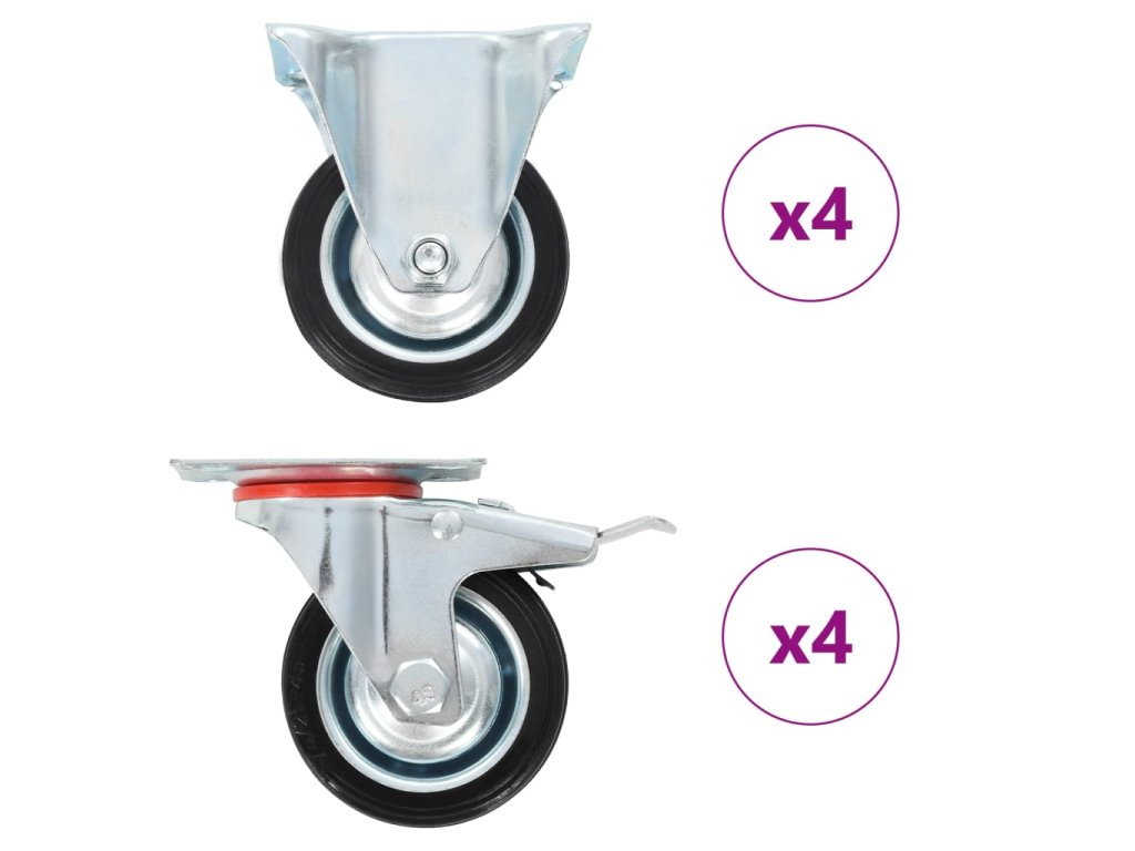 Kolečka jsou vyrobená z gumy, která je známá pro svou schopnost pohlcovat nárazy a vibrace. Ať už tedy kolečka namontujete na cokoliv, budete to moci přesouvat hladce a v tichosti. Jejich hladký povrch navíc ochrání vaši podlahu před poškrábáním. Zinkem potažený ocelový rám je odolný proti rzi, a tudíž kolečkům dodává na odolnosti a prodlužuje jejich životnost. Polovina těchto otočných koleček je vybavená dvojitou brzdou pro flexibilnější ovládání. Každé kolečko má maximální nosnost až 50 kg.