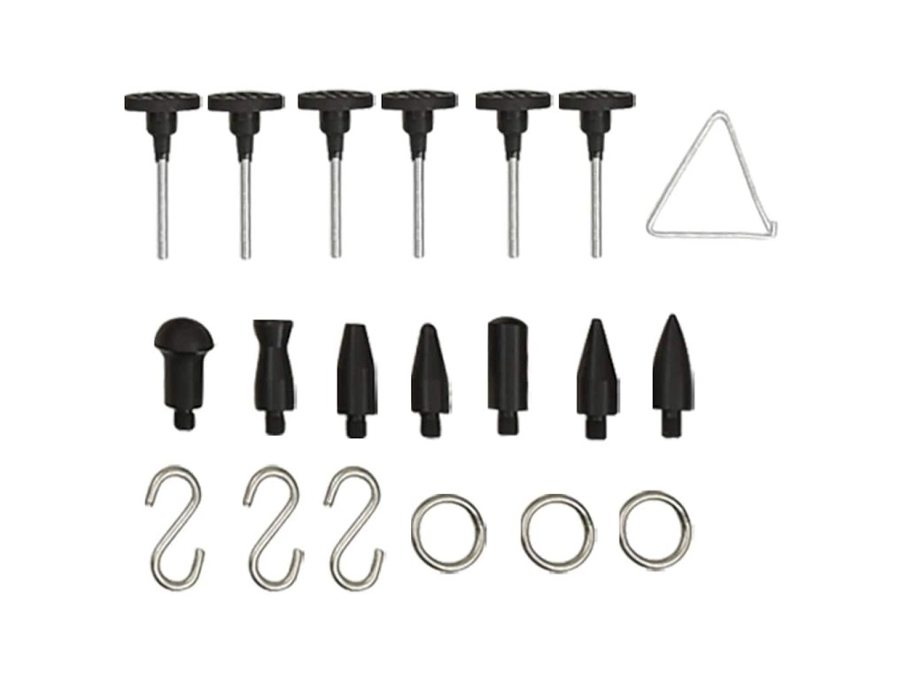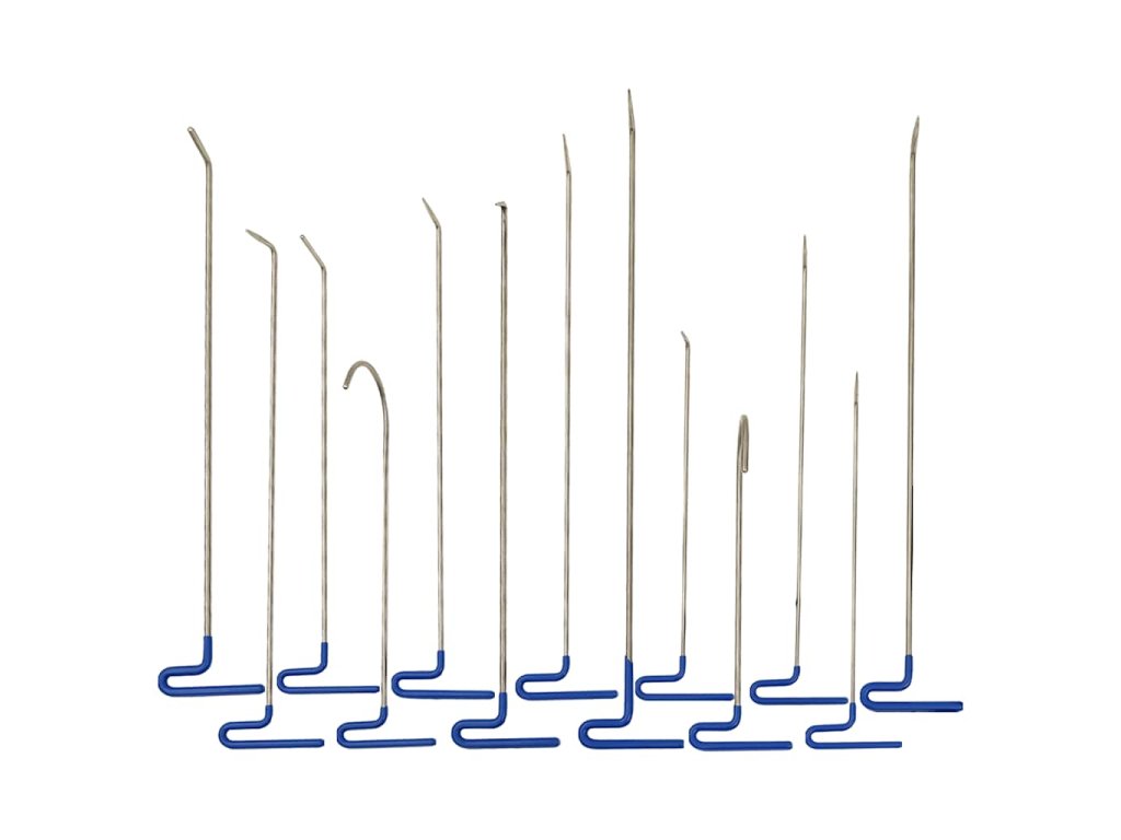Tato sada nářadí na opravu karosérie se dodává s mnoha různými velikostmi lepících přísavek, které jsou vhodné pro většinu promáčklin a důlků od krupobití. Kladivo z nerezové oceli je efektivnější a odstraňuje velké promáčkliny. Modernizovaný příčný vytahovák je vhodný také pro opravu malých a středně velkých důlků. Tato metoda zaručuje účinné a bezpečné odstranění promáčklin, které může ochránit lak karoserie. Linkovaný kontrolní štít slouží ke kontrole promáčklin na rovném kovovém povrchu.