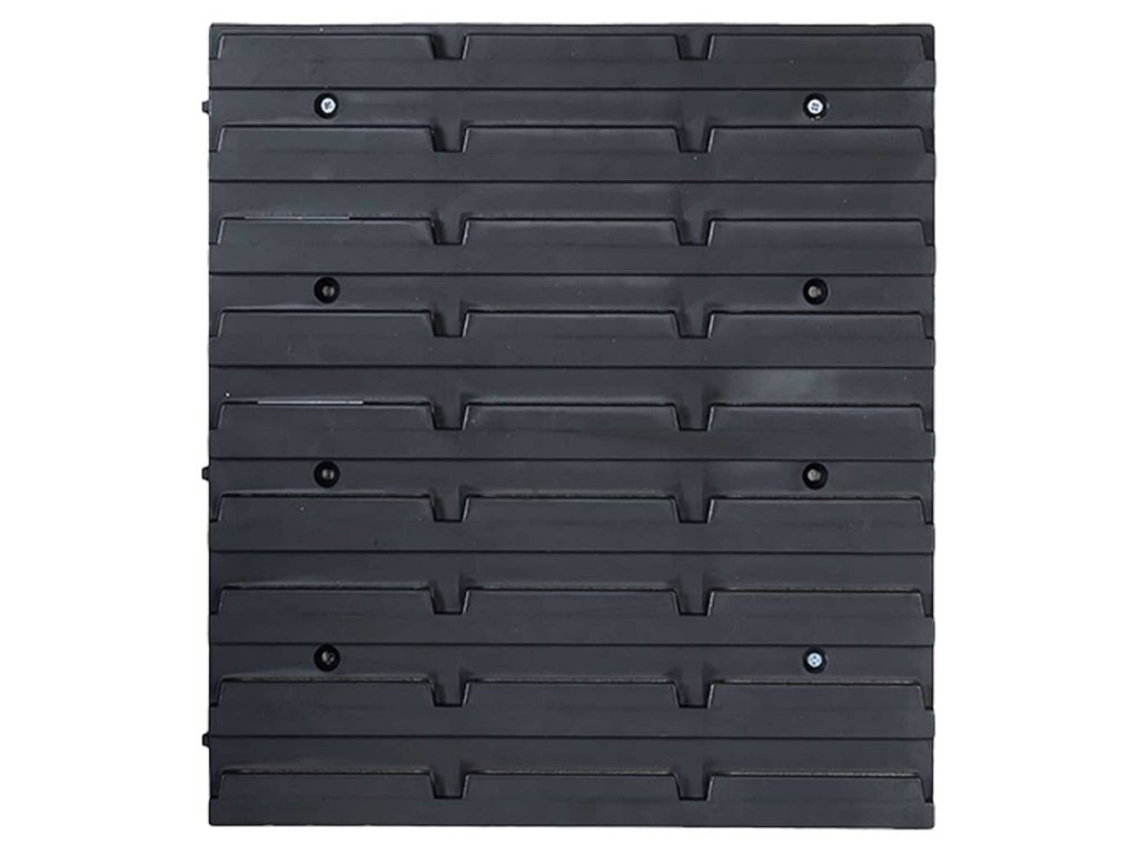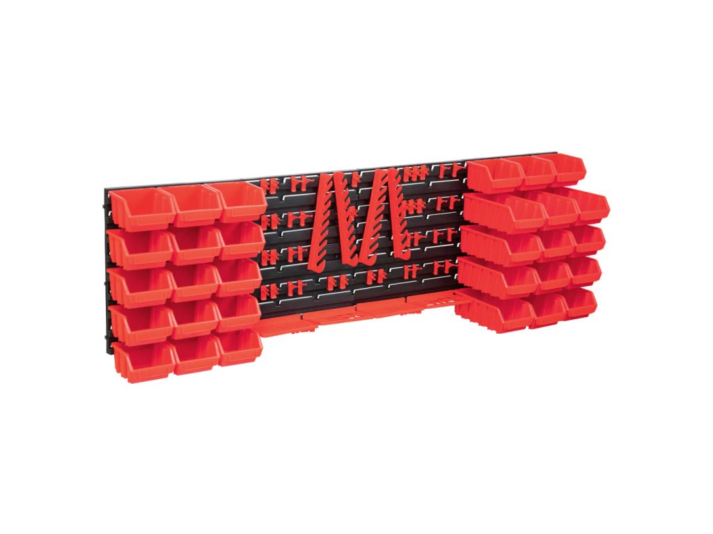 Tyto funkční panely se stohovatelnými boxy nabízí celou řadu možností pro ukládání malých součástek, jako jsou šrouby, hřebíky, matice, objímky, spojky apod. Do 4 pevných nástěnných panelů jsou připevněné držáky a upínače pro nejrůznější typy nářadí a 30 zásobníků, které si lze označit, abyste měli lepší přehled o jejich obsahu. Jednotlivé boxy můžete také samostatně vytahovat a naskládat je na sebe. Sadu panelů na nářadí je možné libovolně rozšiřovat a dá se snadno namontovat na stěnu garáže nebo kůlny. Soupravu skladovacích zásobníků si můžete přizpůsobit dle vlastních potřeb.