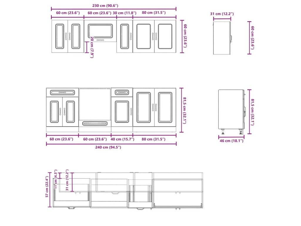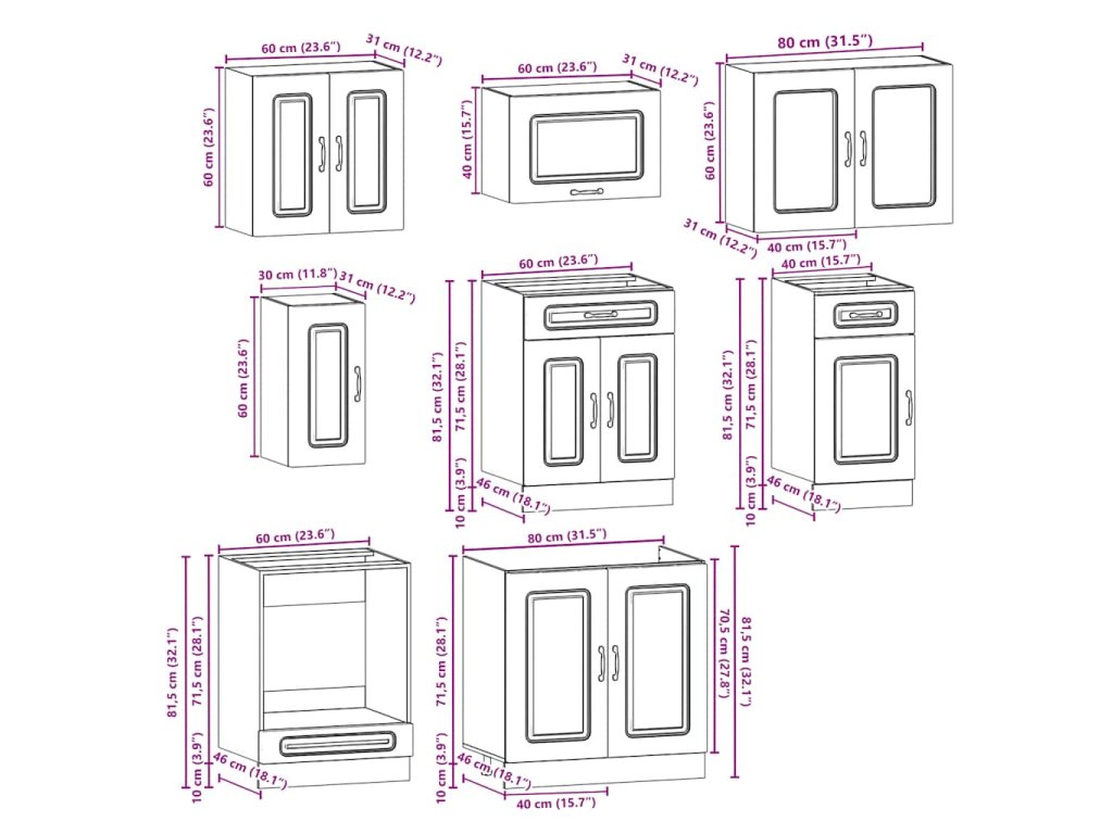 - 1x skříňka na troubu: 60 x 46 x 81,5 cm (Š x H x V)