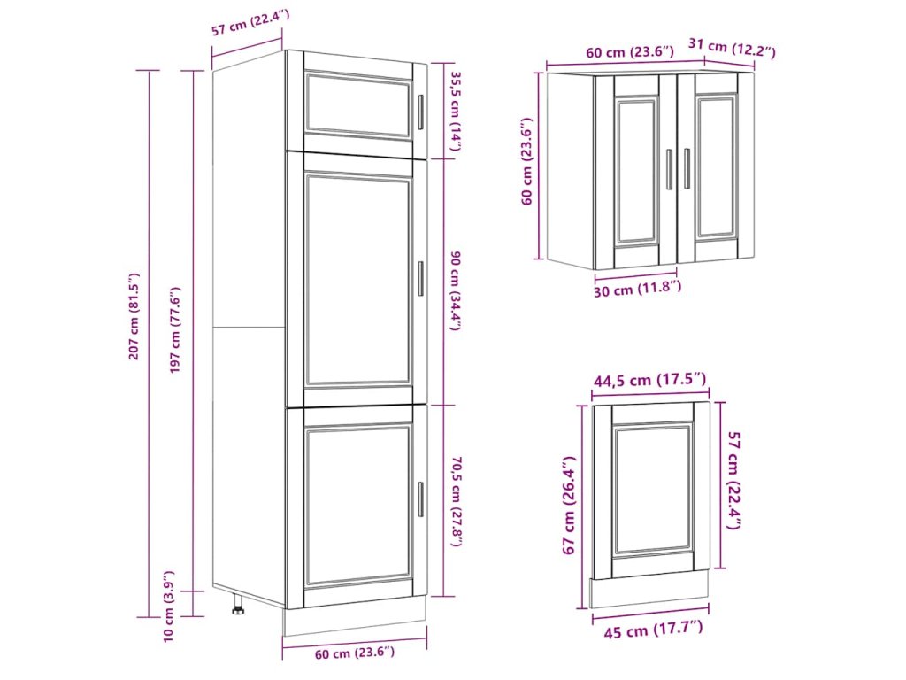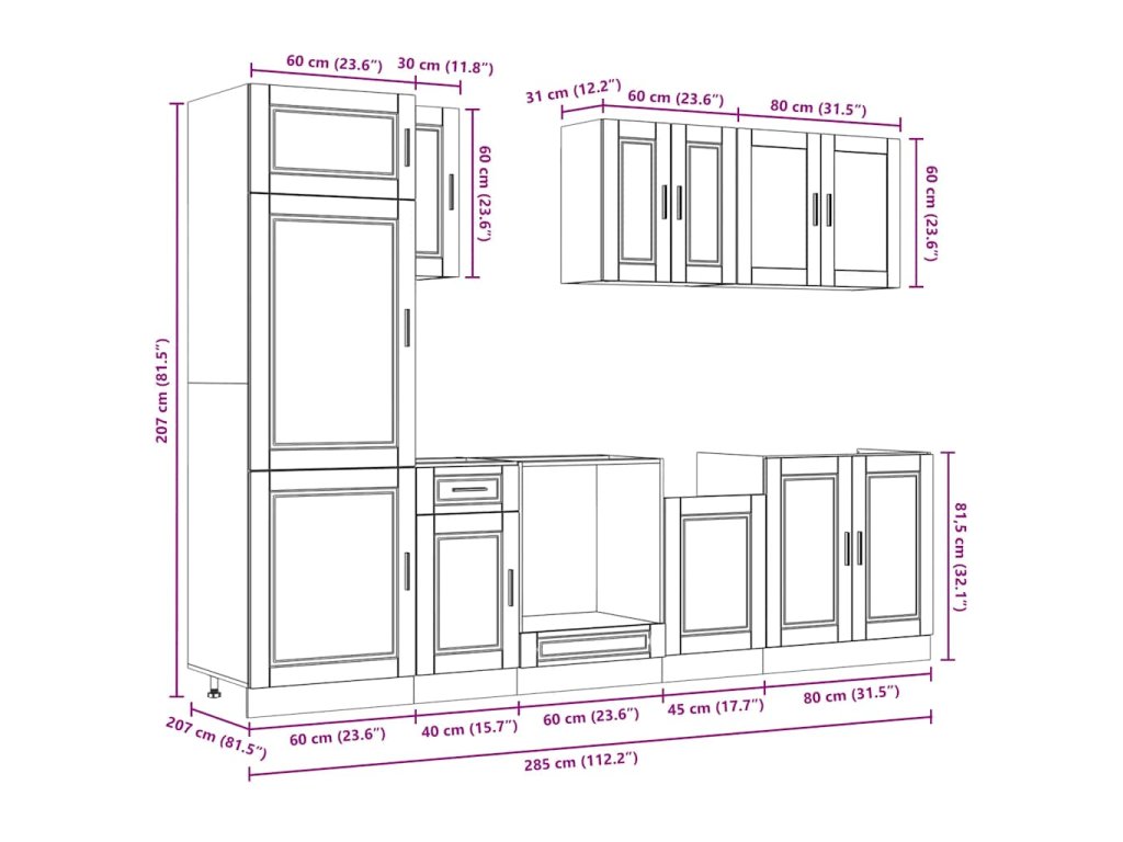 - 1x skříňka na troubu: 60 x 46 x 81,5 cm (Š x H x V)