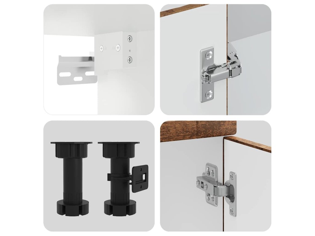 - Nastavitelné nožičky: Spodní skříňky mají nastavitelné nožičky, jejichž výšku lze nastavit tak, aby vyhovovaly uspořádání vaší kuchyně.