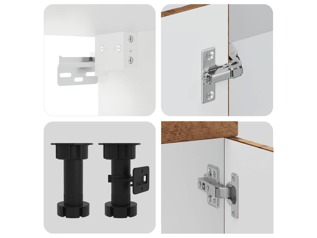 - Nastavitelné nožičky: Spodní skříňky mají nastavitelné nožičky, jejichž výšku lze nastavit tak, aby vyhovovaly uspořádání vaší kuchyně.