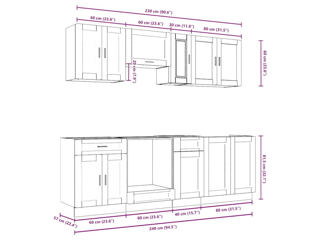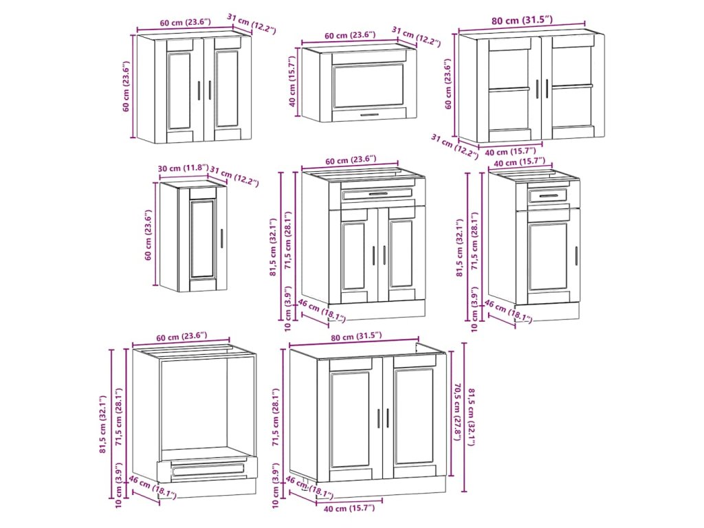- 1x skříňka na troubu: 60 x 46 x 81,5 cm (Š x H x V)