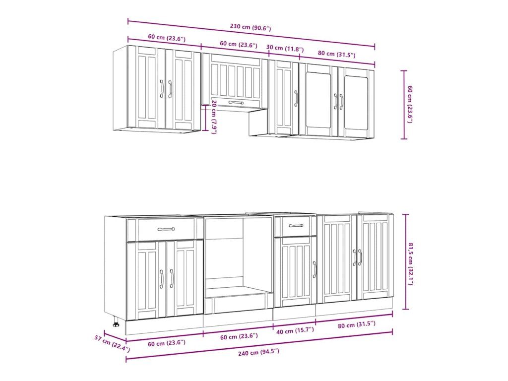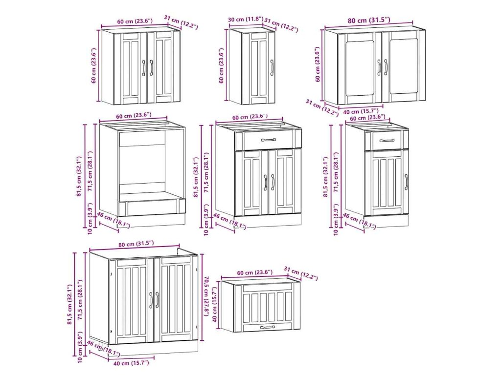 - Dostatek úložného prostoru: Sada kuchyňských skříněk má mnoho přihrádek a nabízí dostatek prostoru pro uložení misek, talířů, hrnců a dalších kuchyňských spotřebičů.