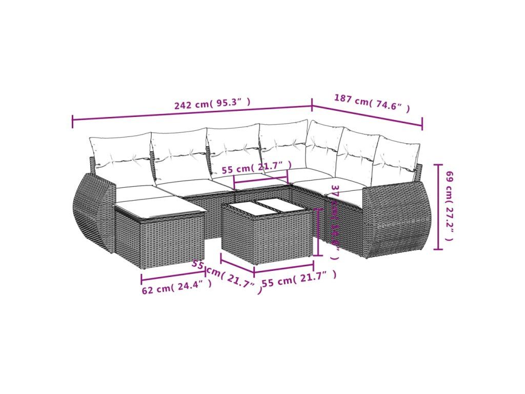 Tato zahradní sedací souprava je dokonalým doplňkem vaší zahrady, terasy nebo dvorku a poskytne vám pohodlné a příjemné místo, kde si můžete povídat s rodinou a přáteli nebo jen tak odpočívat a užívat si pobyt venku.