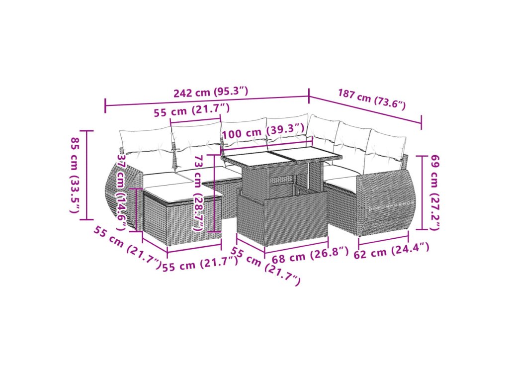 Tato zahradní sedací souprava je dokonalým doplňkem vaší zahrady, terasy nebo dvorku a poskytne vám pohodlné a příjemné místo, kde si můžete povídat s rodinou a přáteli nebo jen tak odpočívat a užívat si pobyt venku.