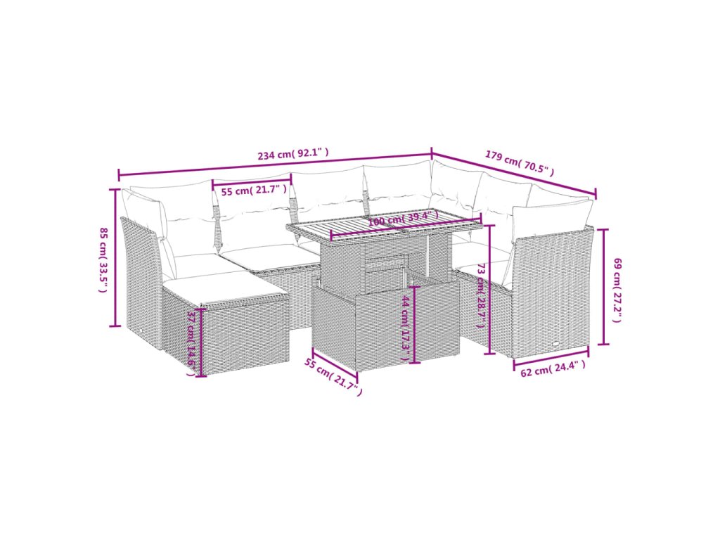 Tato zahradní sedací souprava je dokonalým doplňkem vaší zahrady, terasy nebo dvorku a poskytne vám pohodlné a příjemné místo, kde si můžete povídat s rodinou a přáteli nebo jen tak odpočívat a užívat si pobyt venku.