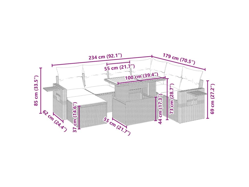 Tato zahradní sedací souprava je dokonalým doplňkem vaší zahrady, terasy nebo dvorku a poskytne vám pohodlné a příjemné místo, kde si můžete povídat s rodinou a přáteli nebo jen tak odpočívat a užívat si pobyt venku.