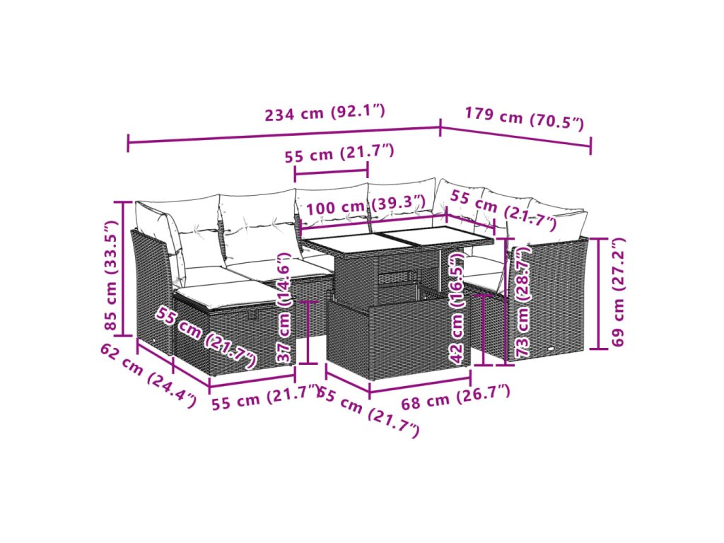 Tato zahradní sedací souprava je dokonalým doplňkem vaší zahrady, terasy nebo dvorku a poskytne vám pohodlné a příjemné místo, kde si můžete povídat s rodinou a přáteli nebo jen tak odpočívat a užívat si pobyt venku.