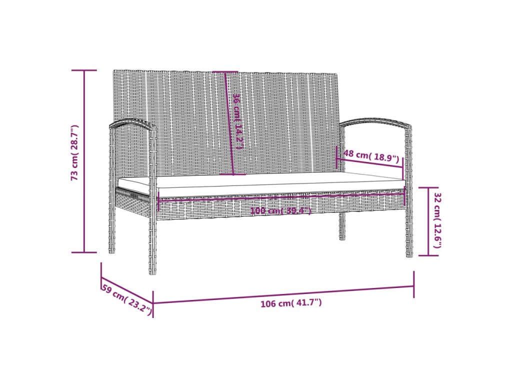 - Rozměry 2místné pohovky: 106 x 59 x 73 cm (Š x H x V)
