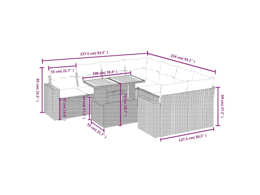 Tato zahradní sedací souprava je dokonalým doplňkem vaší zahrady, terasy nebo dvorku a poskytne vám pohodlné a příjemné místo, kde si můžete povídat s rodinou a přáteli nebo jen tak odpočívat a užívat si pobyt venku.