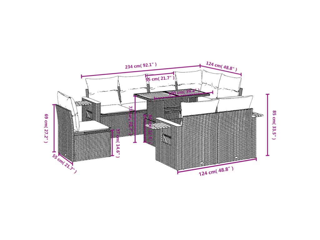Tato zahradní sedací souprava je dokonalým doplňkem vaší zahrady, terasy nebo dvorku a poskytne vám pohodlné a příjemné místo, kde si můžete povídat s rodinou a přáteli nebo jen tak odpočívat a užívat si pobyt venku.