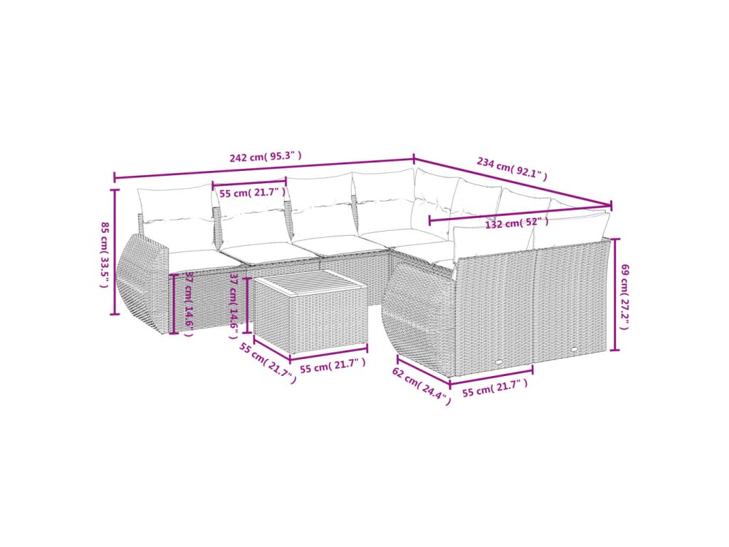 Tato zahradní sedací souprava je dokonalým doplňkem vaší zahrady, terasy nebo dvorku a poskytne vám pohodlné a příjemné místo, kde si můžete povídat s rodinou a přáteli nebo jen tak odpočívat a užívat si pobyt venku.
