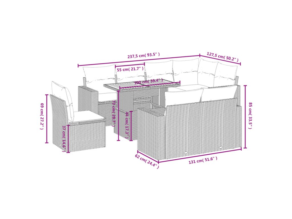 Tato zahradní sedací souprava je dokonalým doplňkem vaší zahrady, terasy nebo dvorku a poskytne vám pohodlné a příjemné místo, kde si můžete povídat s rodinou a přáteli nebo jen tak odpočívat a užívat si pobyt venku.