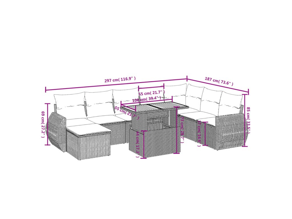 Tato zahradní sedací souprava je dokonalým doplňkem vaší zahrady, terasy nebo dvorku a poskytne vám pohodlné a příjemné místo, kde si můžete povídat s rodinou a přáteli nebo jen tak odpočívat a užívat si pobyt venku.