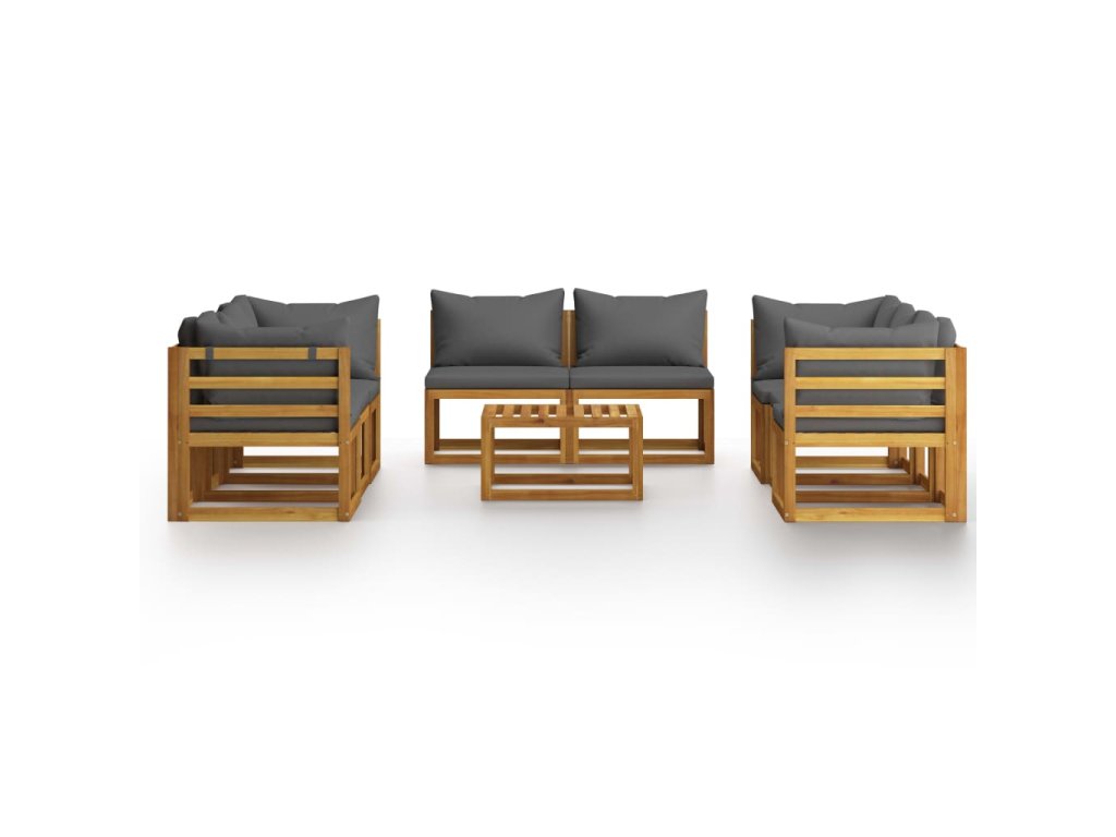 Rám z masivního akáciového dřeva je pevný, odolný a má dlouhou životnost. Dřevo je napuštěné olejem, sedací souprava je proto vhodná i pro venkovní použití. Odnímatelné podušky na sedáky a opěradla jsou silně polstrované, takže se vám na nich bude nesmírně dobře sedět. Součástí balení je také konferenční stolek v unikátním laťkovém provedení. Nevšední modulární design vám umožní všechny díly přestavovat a upravovat dle momentálních potřeb.
