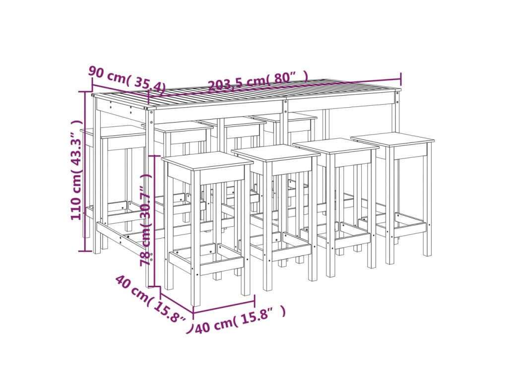 - Rozměry barového stolu: 203,5 x 90 x 110 cm (Š x H x V)