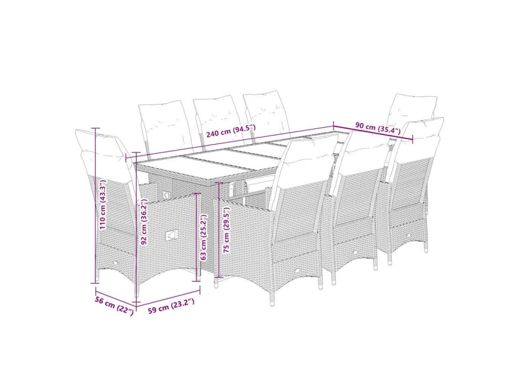 - Rozměry: 240 x 90 x 75 cm (D x Š x V)