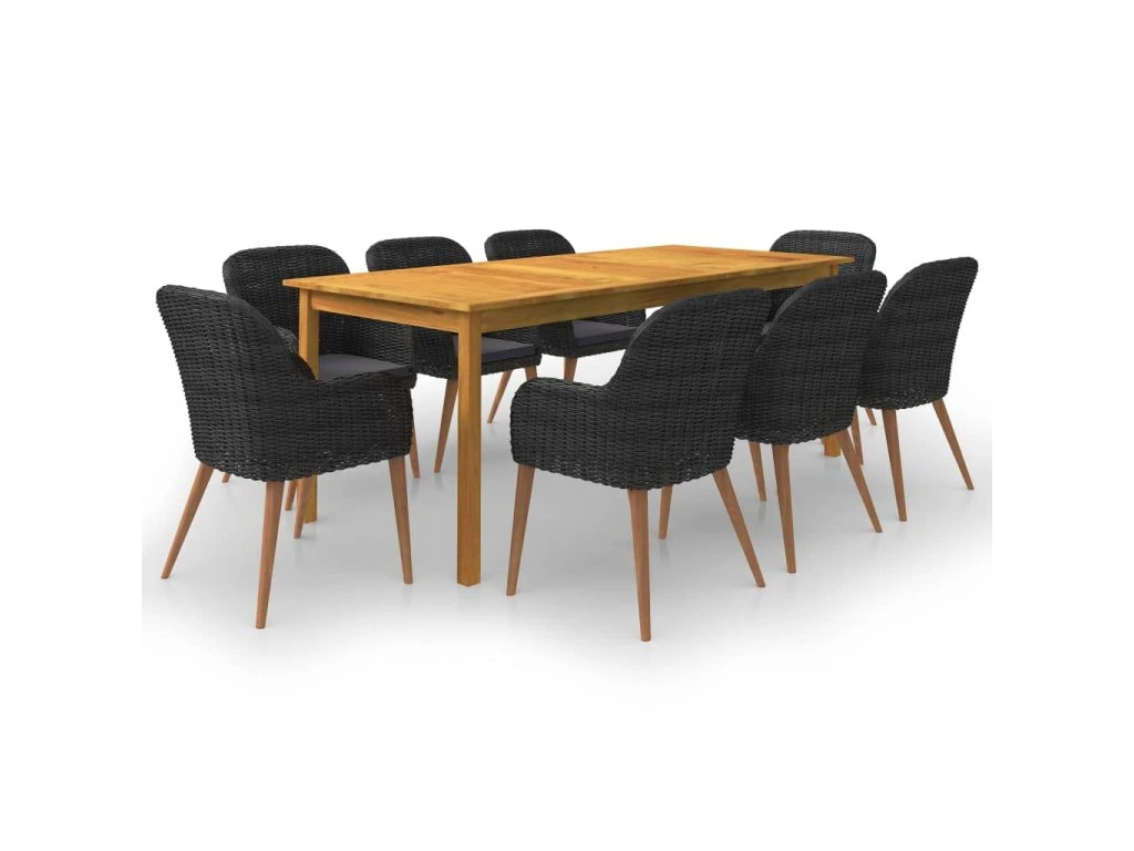 Jídelní stůl je zhotovený z masivního akáciového dřeva s olejovaným povrchem, takže je stabilní, odolný a nenáročný na údržbu. Jídelní židle mají rám z práškově lakované oceli, opletený PE ratanem, který výborně vzdoruje klimatickým vlivům. Dlouho vám proto vydrží a snadno je očistíte. Ergonomický tvar spolu s hustě polstrovanými poduškami vám při sezení zaručí maximální pohodlí. Polyesterové potahy podušek nevyžadují téměř žádnou údržbu a dají se jednoduše stáhnout a oprat.