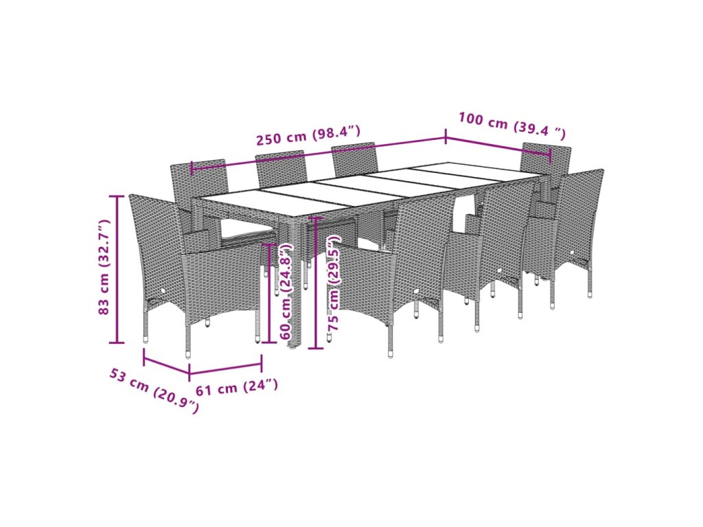 - Skleněná deska stolu: Deska venkovního stolu je zhotovena ze silného a odolného tvrzeného skla, takže ji snadno očistíte vlhkým hadříkem a zároveň do vašeho venkovního prostoru vnese nádech elegance.