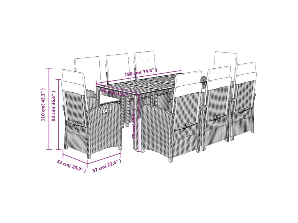 - Materiál: PE ratan, práškově lakovaná ocel, masivní akáciové dřevo s olejovou povrchovou úpravou
