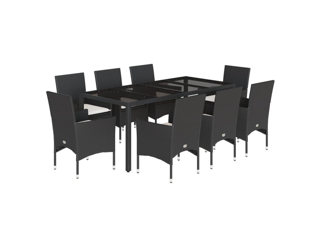 9dílný zahradní jídelní set s poduškami černý polyratan a sklo 3278542