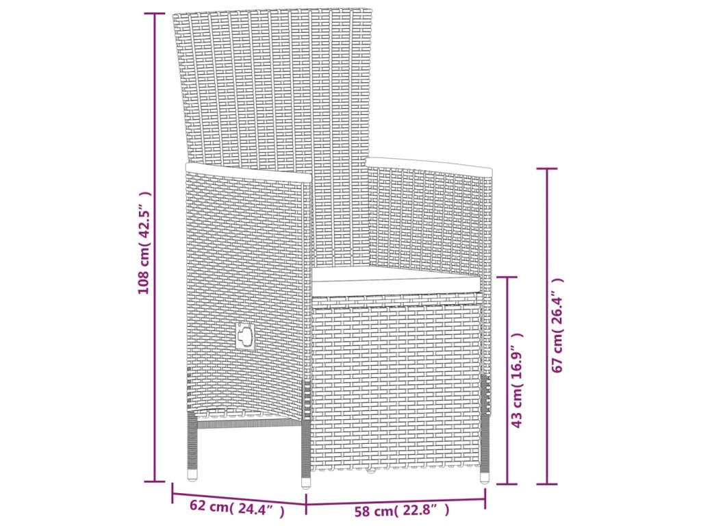 - Rozměry židle (nesklopená): 58 x 62 x 108 cm (Š x H x V)