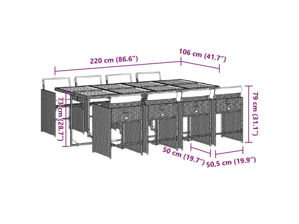 - Rozměry: 220 x 106 x 73 cm (D x Š x V)