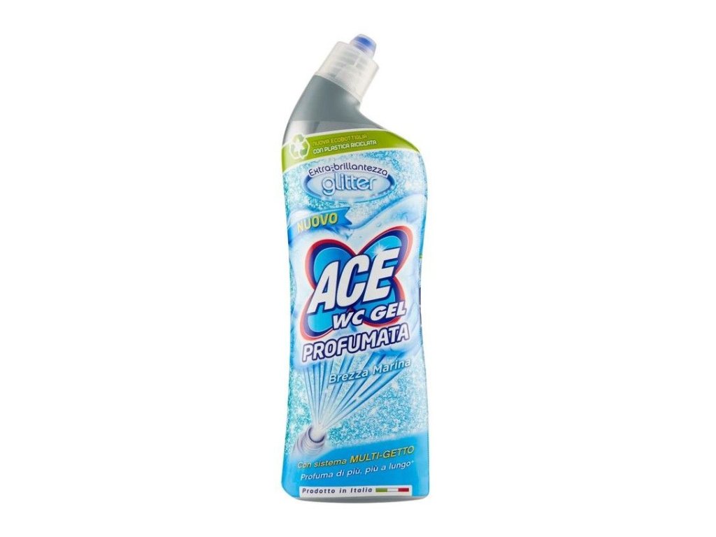 Přípravek na toalety, bidety a pisoáry Ace WC gel Profumata Brezza Marina s intenzivní mořskou a limetkovou vůní. Díky novému vylepšenému aplikátoru se šesti otvory vyčistí i ty nejméně přístupná místa. Účinkuje po celém obvodu i pod okrajem toalety, pomáhá předcházet tvorbě usazenin a vodního kamene, eliminuje nepříjemné pachy a dodá brilantní lesk.