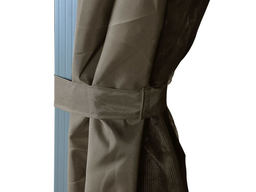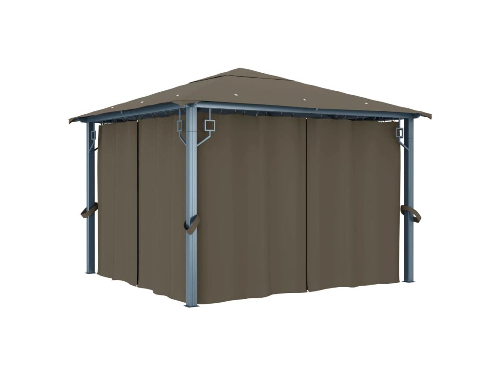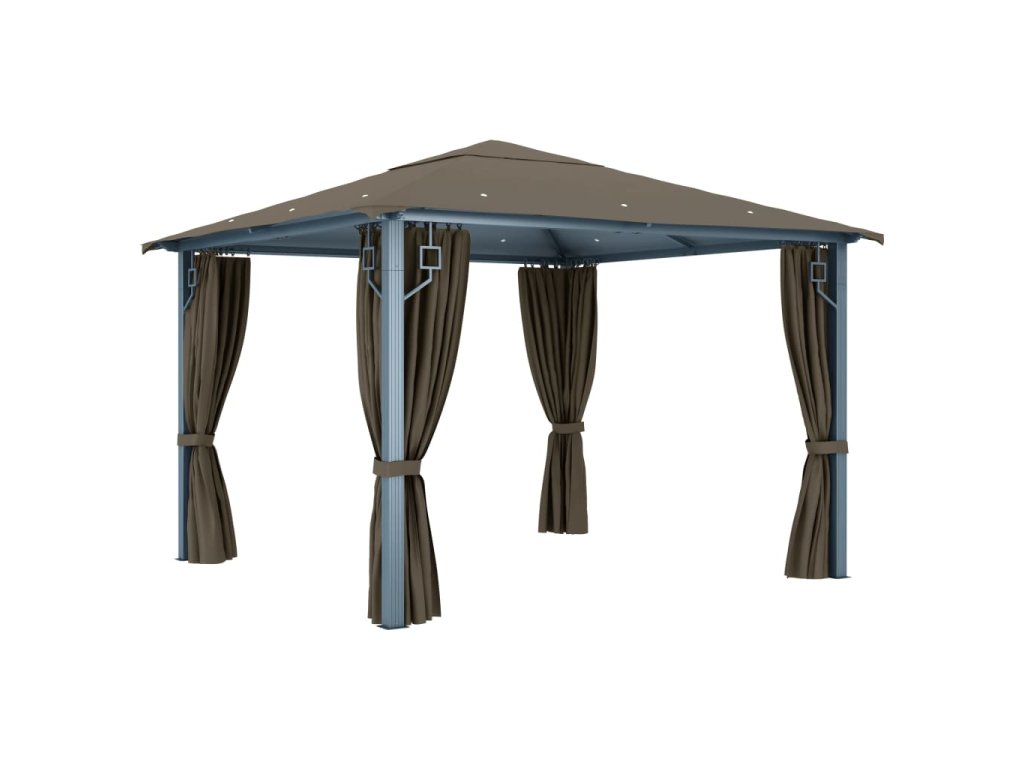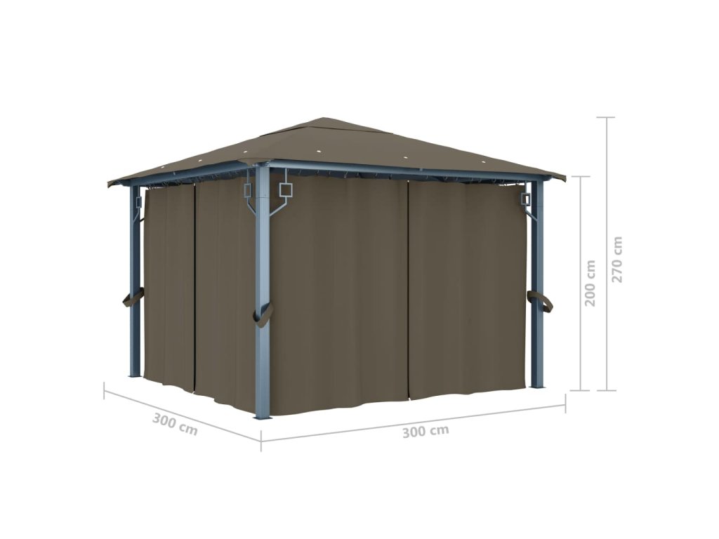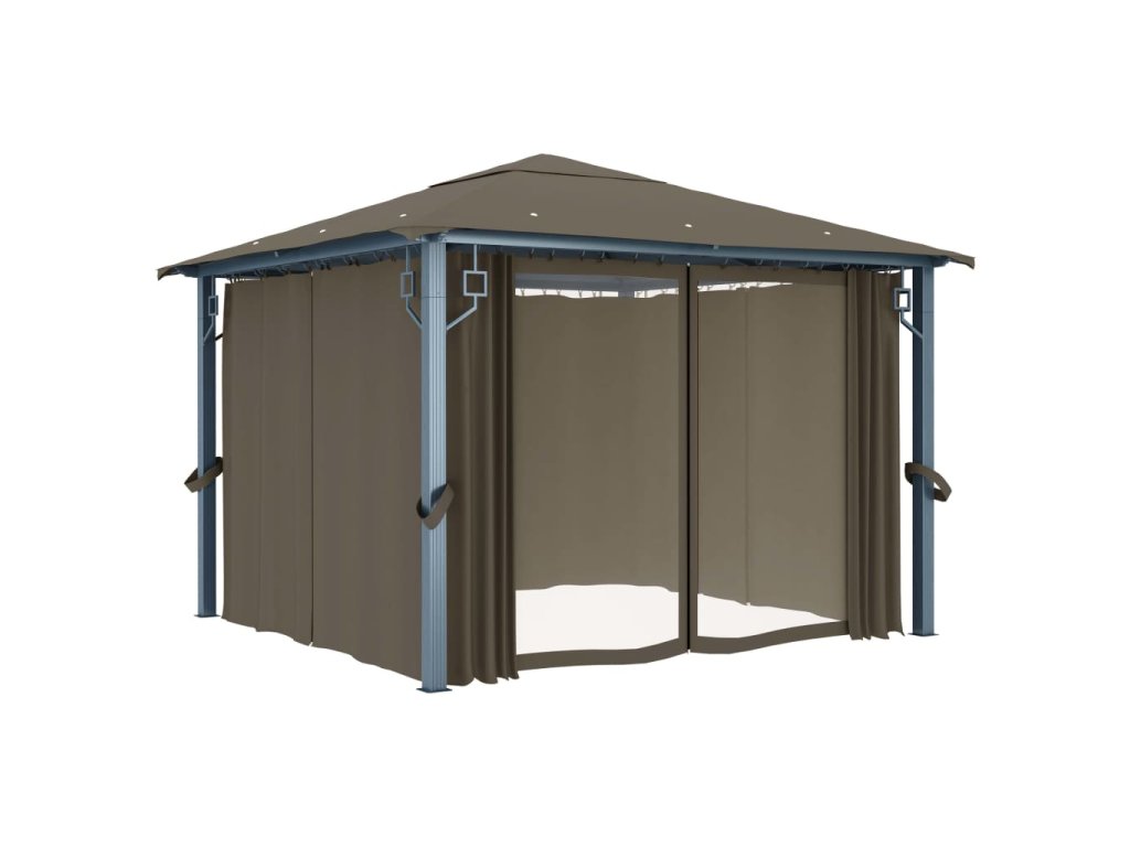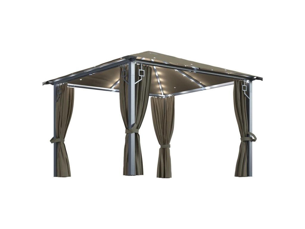 Altán se závěsy a světelnými LED řetězy 3 x 3 m taupe hliník 3070334