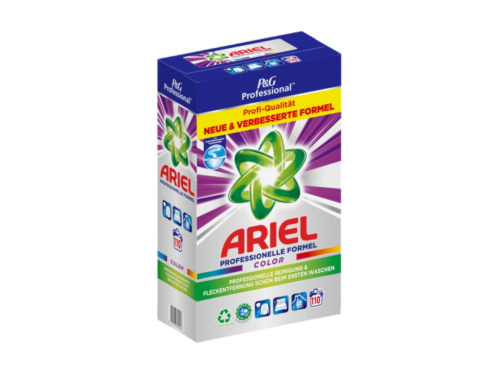 Ariel Professional je profesionální prášek na praní - speciálně vyvinutý pro vynikající výsledky již při prvním vyprání: vynikající odstraňování skvrn, hluboké čištění, brilantní bělost, skvělá svěžest a účinnost při nízkých teplotách. Prostředek není vhodný na praní vlny, hedvábí, černého a tmavého prádla. Vhodný pro praní od 20 do 95 stupňů.