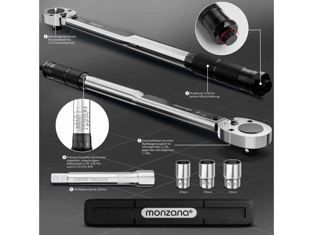 1× momentový klíč s 3 nástavci (17, 19, 21 mm)