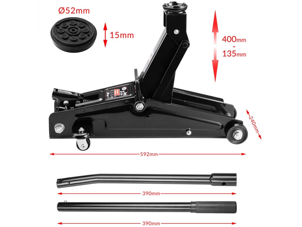 Tento robustní hydraulický autozvedák je ideálním pomocníkem pro dílnu i domácí garáž. S maximální nosností 3 tuny a zdvihem od 135 do 400 mm zvládne bezpečně zvednout osobní automobily, SUV, dodávky i zemědělské stroje. Díky velkému otočnému podložnímu talíři a dlouhé pumpovací páce je práce s ním snadná a efektivní.