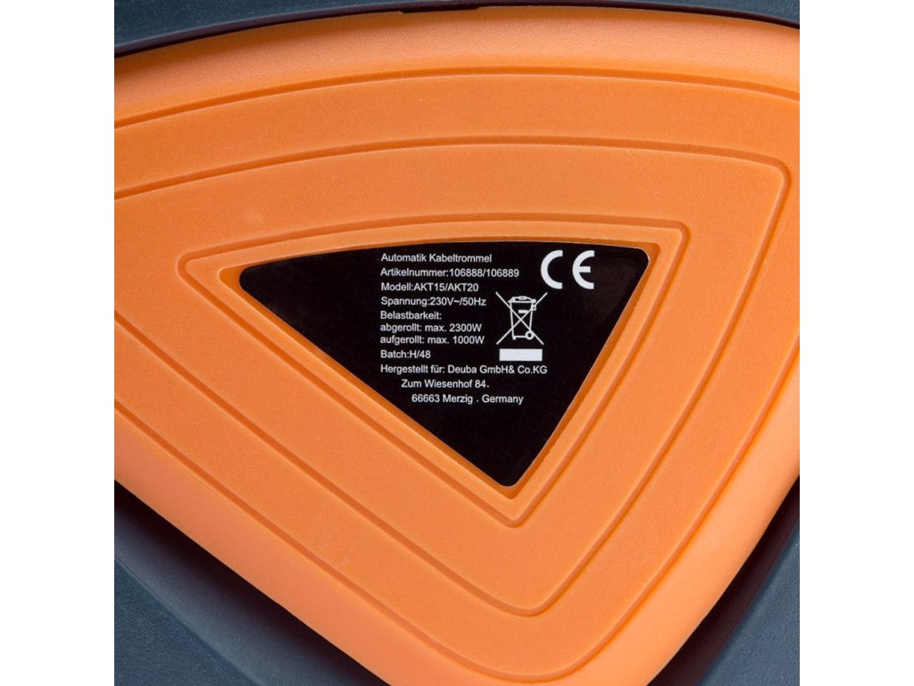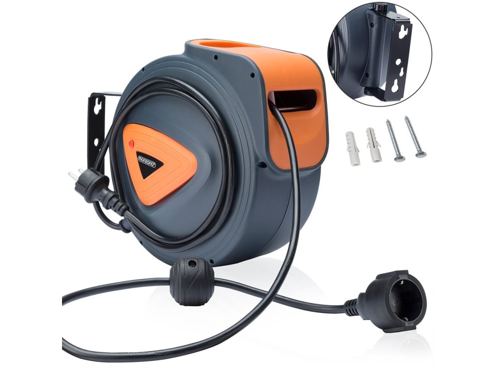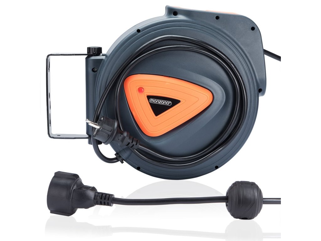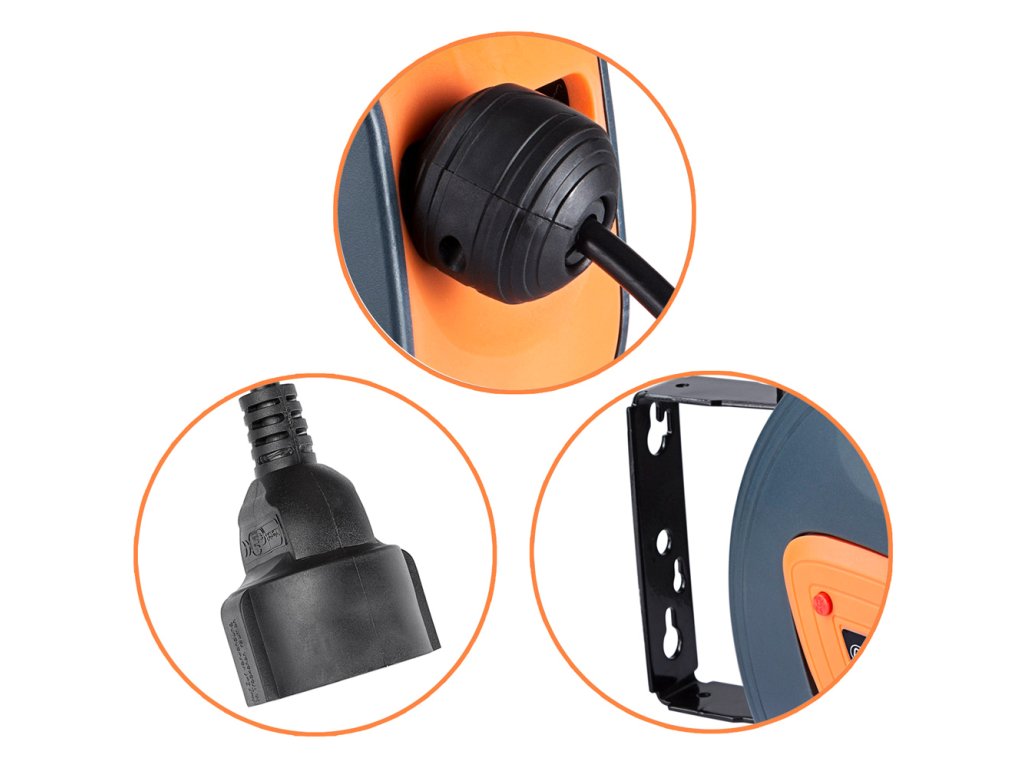 Kabelová bubna je vybavena odnímatelným držákem pro montáž na zeď, který umožňuje otočení o 180° pro maximální flexibilitu při používání. Robustní pouzdro z polypropylenu chrání kabel před poškozením a součástí je také přepěťová ochrana a nastavitelný doraz pro kontrolu délky kabelu.