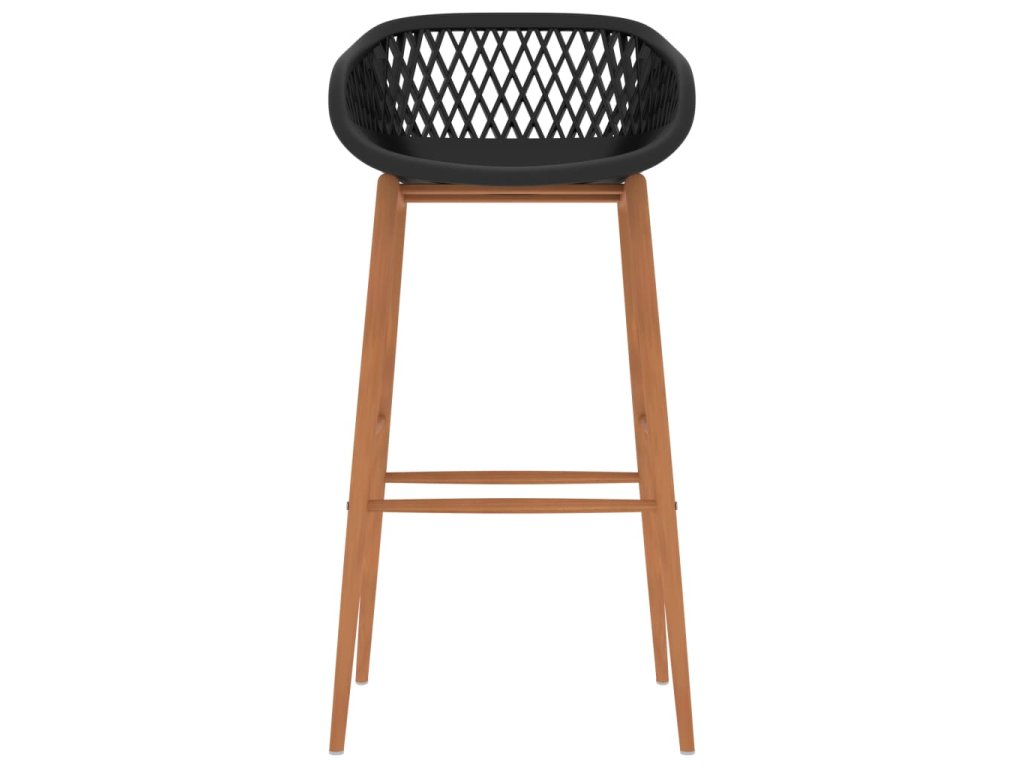 Barové židle mají ergonomicky tvarované sedadlo s integrovaným nízkým opěradlem a vyplétaným vzhledem. Jsou vyrobené z robustního PP materiálu a stojí na pevných kovových nohách s transférovým potiskem s dřevěným vzhledem, takže jsou robustní a odolné.